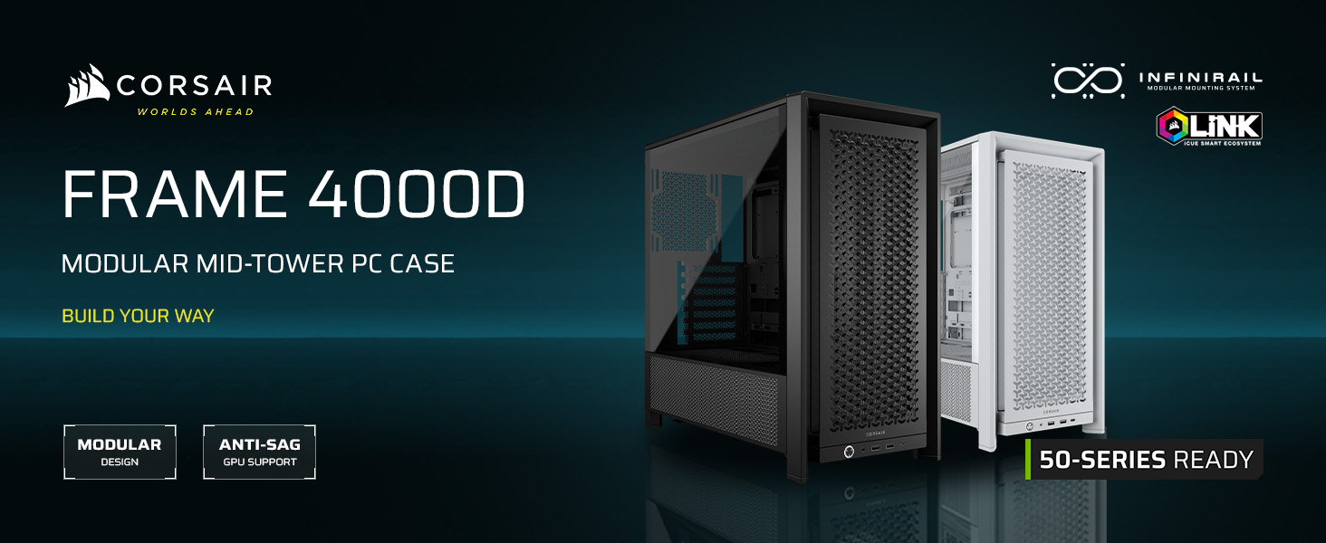 Equipped with Corsair’s innovative InfiniRail fan mounting system, the 4000D Frame allows easy adjustment of fan positions to optimize airflow or accommodate custom cooling configurations. Support for dual 360 mm radiators provides exceptional compatibility for advanced liquid cooling setups, making it ideal for powerful CPUs and GPUs. The spacious interior supports ATX, micro-ATX, and mini-ITX motherboards, along with large graphics cards and tall CPU coolers.