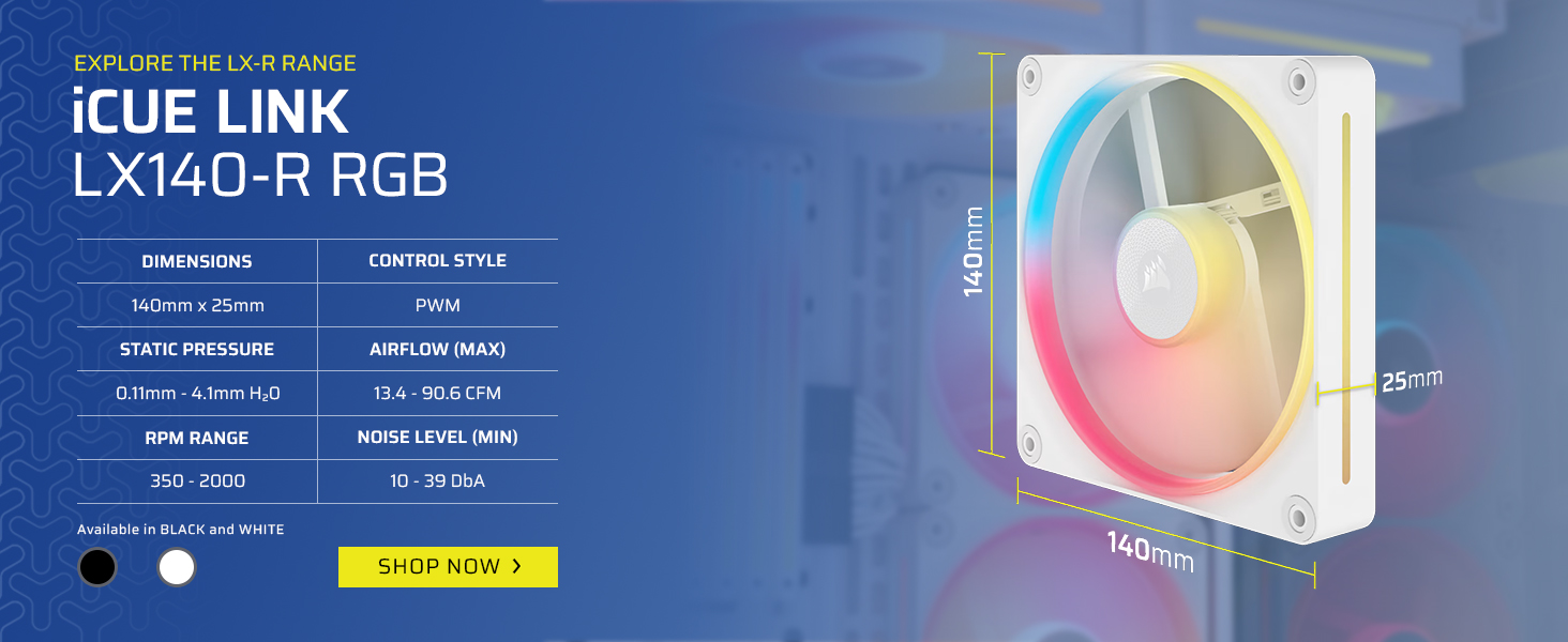 The Corsair iCUE Link LX140-R RGB PWM 140mm White Case Fans Starter Kit (CO-9051056-WW) is engineered for builders who demand both high-performance cooling and standout aesthetics. This dual pack includes two 140mm fans with stunning addressable RGB lighting, each capable of reaching speeds up to 2000 RPM for exceptional airflow and static pressure. Whether you’re building a white-themed PC or upgrading your current setup, these fans offer a sleek, modern look and powerful thermal performance.