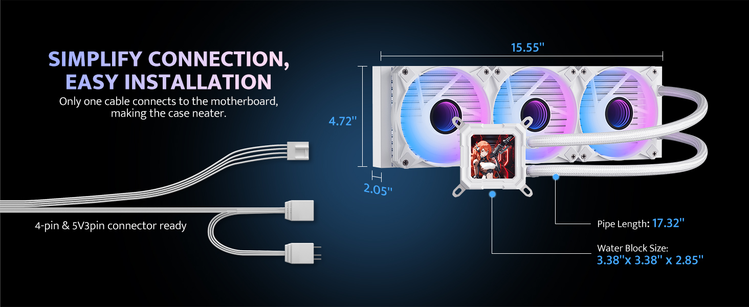 Engineered for broad compatibility, the DF-DV360S-WH supports Intel LGA 1851 / 1700 and AMD AM4 / AM5 sockets, making it an ideal choice for both new and upgraded systems. The precision-machined copper cold plate ensures excellent thermal conductivity, while the PWM fan control automatically balances cooling and noise for optimal system performance.