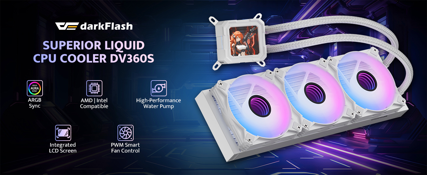DarkFlash Liquid CPU Cooler LCD Screen ARGB PWM Radiator Aio Compatible w/Intel 1851/1700, AMD AM4/AM5 (White) DF-DV360S-WH