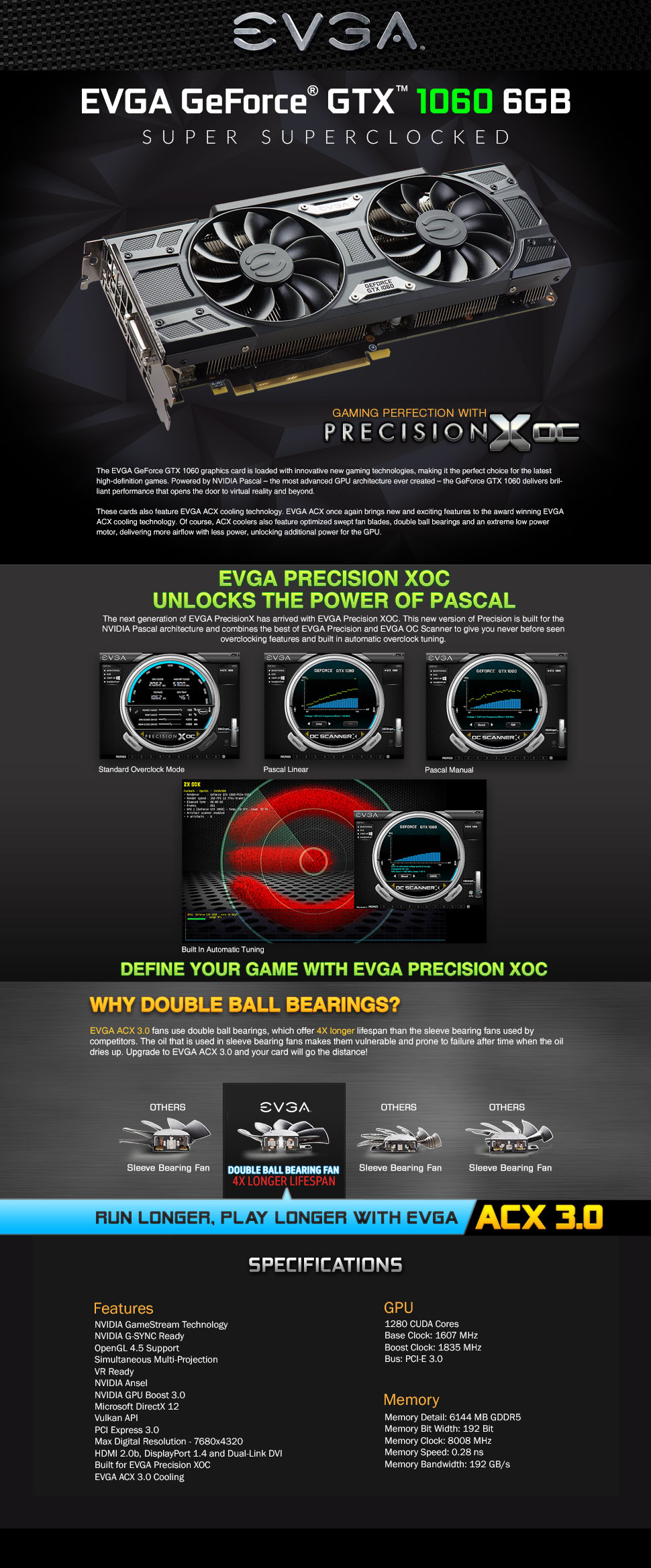 EVGA 06G-P4-6267-KR GeForce GTX 1060 6GB SSC GAMING ACX 3.0, 6GB GDDR5, LED, DX12 OSD Support (PXOC) Graphics Card