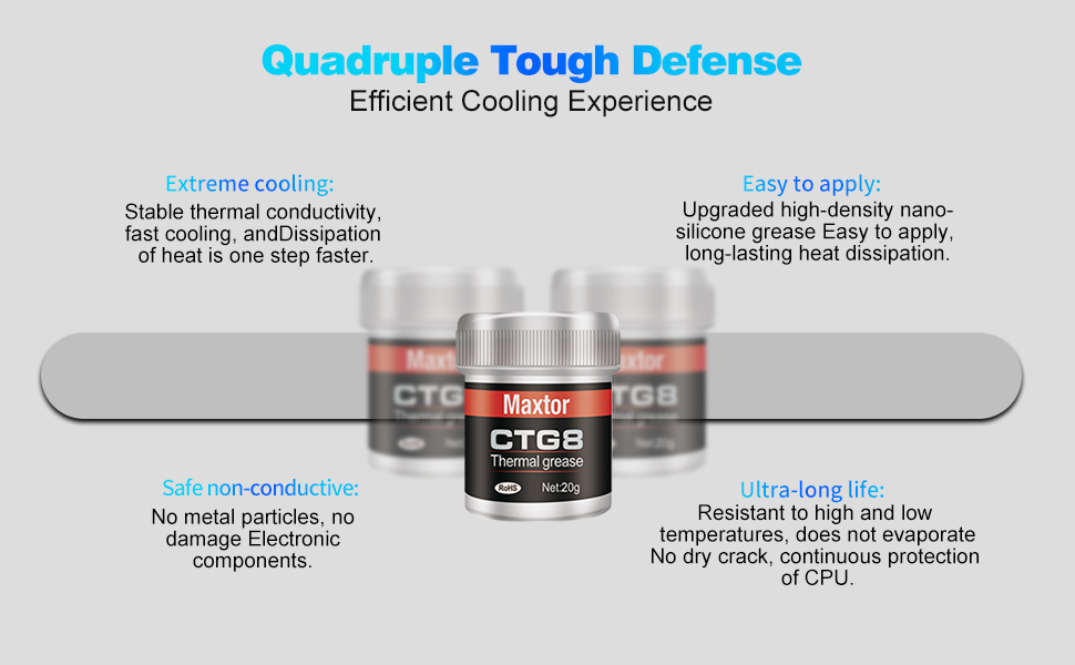 Upgrade your system’s cooling with the Maxtor CTG8EL-20g Thermal Paste, designed for efficient heat transfer and long-lasting thermal performance. With a thermal conductivity of 12.8W/mK, this carbon-based compound effectively reduces the temperature of your CPU, GPU, ICs, and other heat-sensitive components, ensuring better system stability and performance under heavy load.