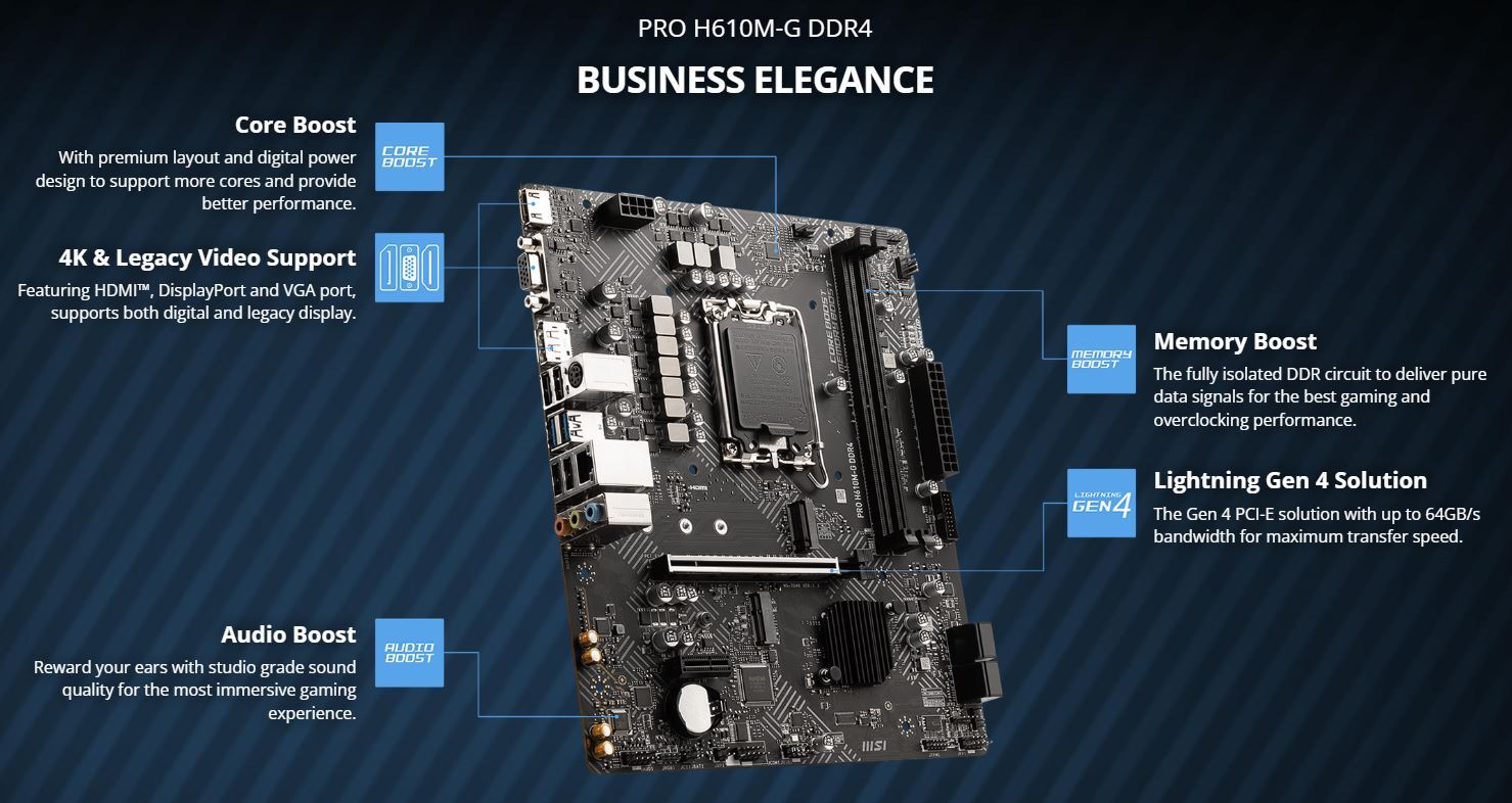 The MSI PRO H610M-G DDR4 is engineered with Core Boost technology, a reinforced PCIe slot, and comprehensive circuit protection, making it a smart choice for professionals and system builders alike. Whether you're assembling a budget-friendly workstation or a home office PC, this motherboard combines MSI’s trusted quality with essential modern features.