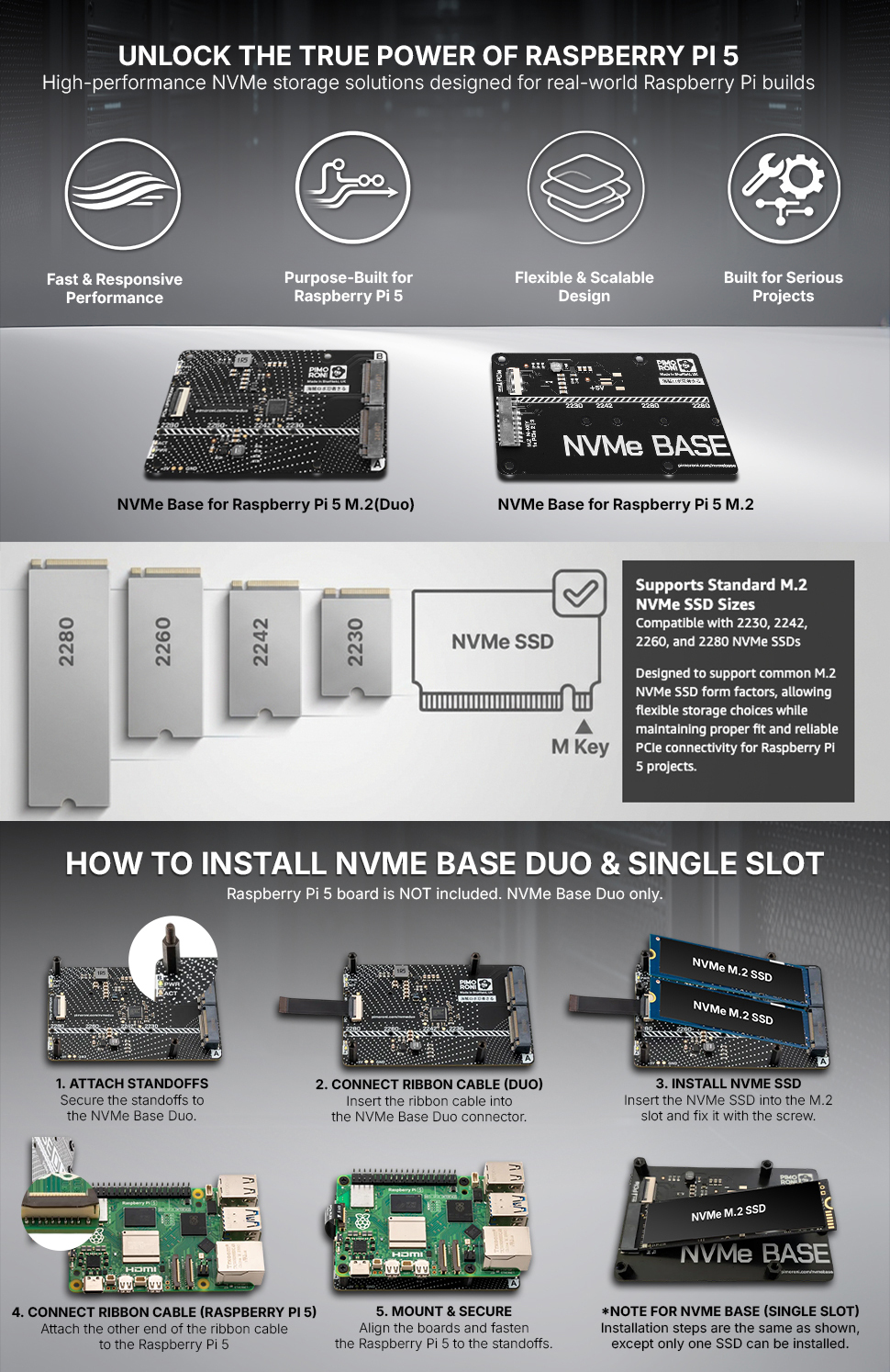 NVMe Base Duo is a PCIe Gen 2 extension board for Raspberry Pi 5. Simply populate it with one or two M-key NVMe SSDs (2230 to 2280 sizes supported) and mount it under (or over) your Pi for a compact and fast storage solution - It even comes with rubber feet!