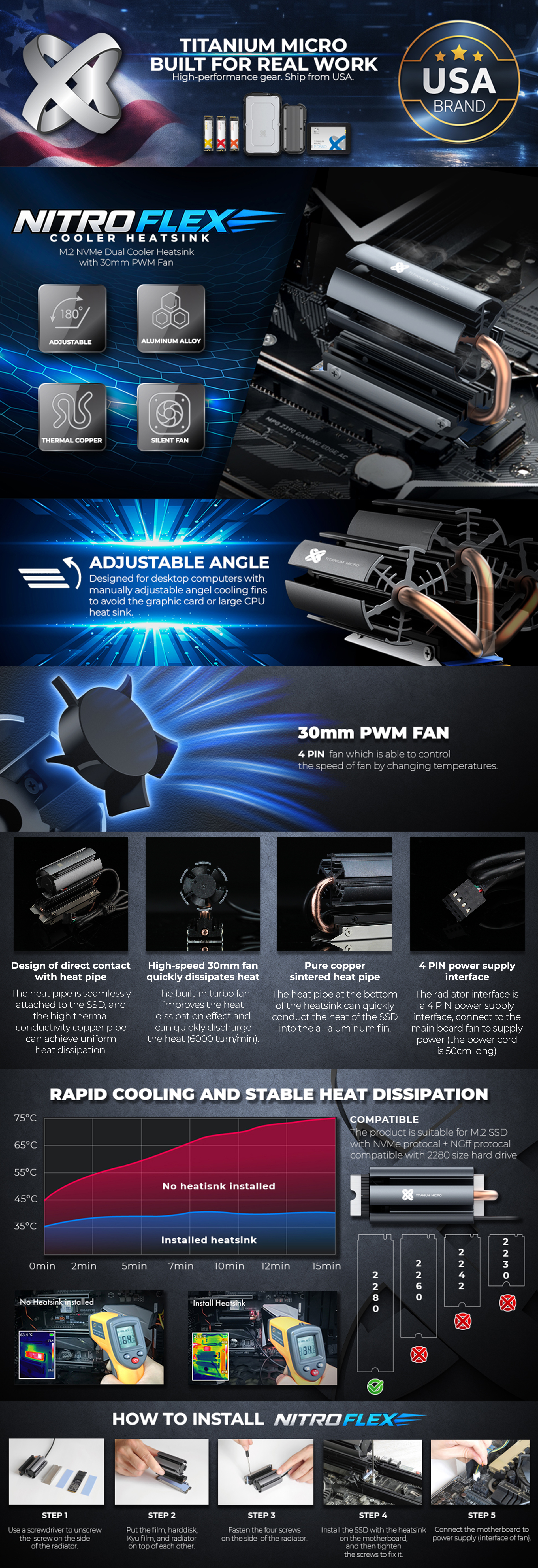 Titanium Micro Nitro Flex M.2 SSD M.2 2280 SSD Rocket Heatsink Built-in 30mm PWM Cooling Fan TMHSFM9NITROFLEX